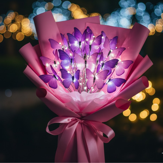 Led Işıklı Pembe&Mor Kelebek Buketi Love Ambalajlı